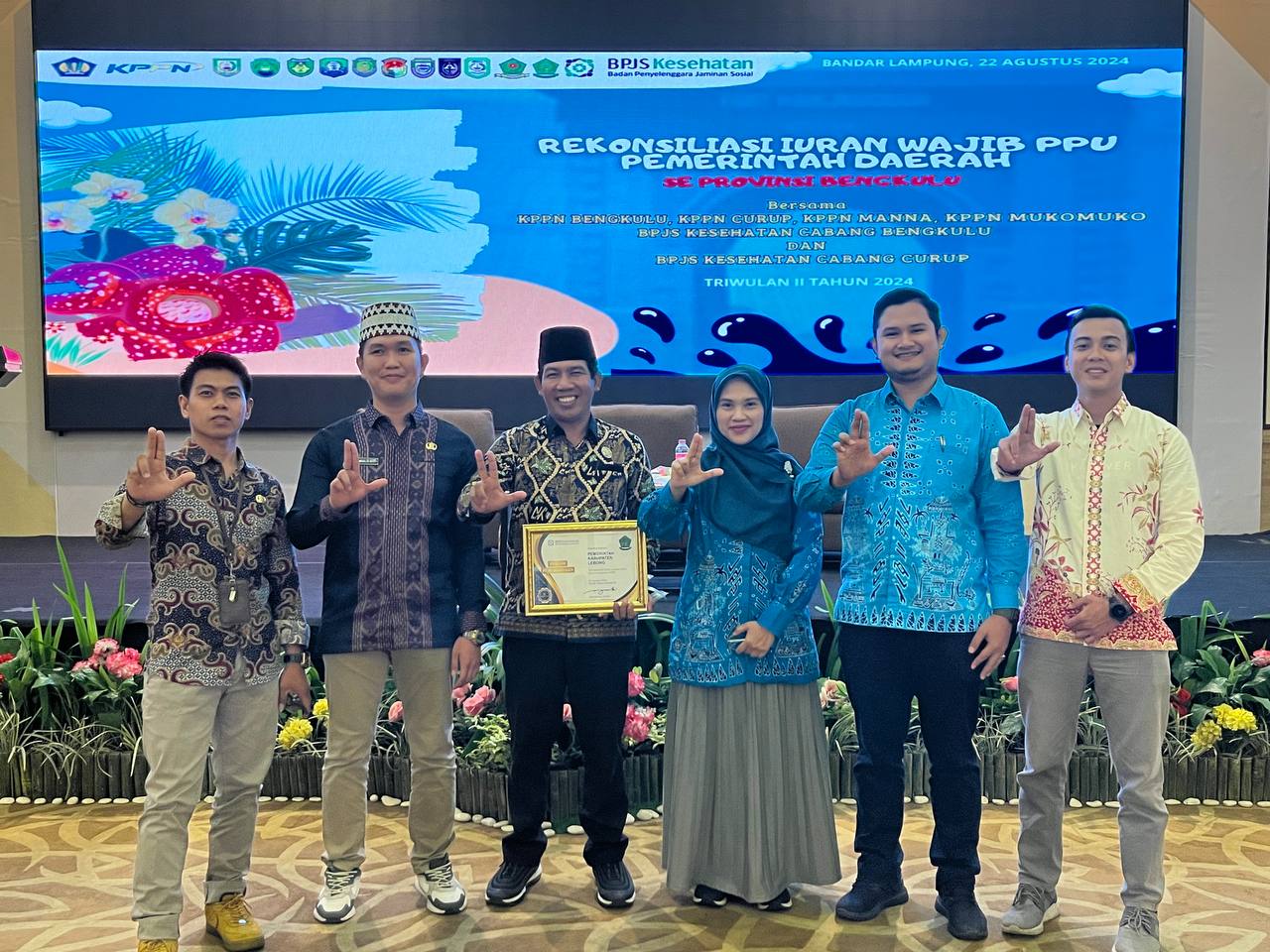 Penghargaan diserahkan langsung oleh kepala BPJS Kesehatan Cabang Curup Eka Natalina Setiani kepada Plt kepala BKD yang diwakilkan oleh Kasubdit Perbendaharaan Sargani S,STP.,ME.,