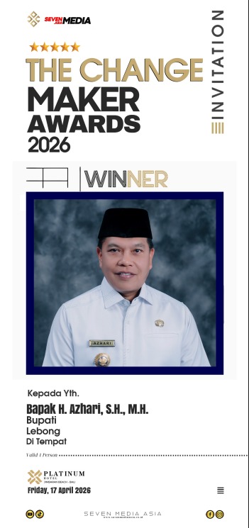 Lebong. PortalBermano.com – Bupati Lebong H,Azhari,SH.,MH., dijadwalkan akan menerima penghargaaan The Change Maker Awards 2026 dari Seven Media. Penghargaan The Change Maker Awards 2026 dari Seven Media akan diserahkan di Platinum Hotel Jimbaran Beach –Bali ( 17/4).