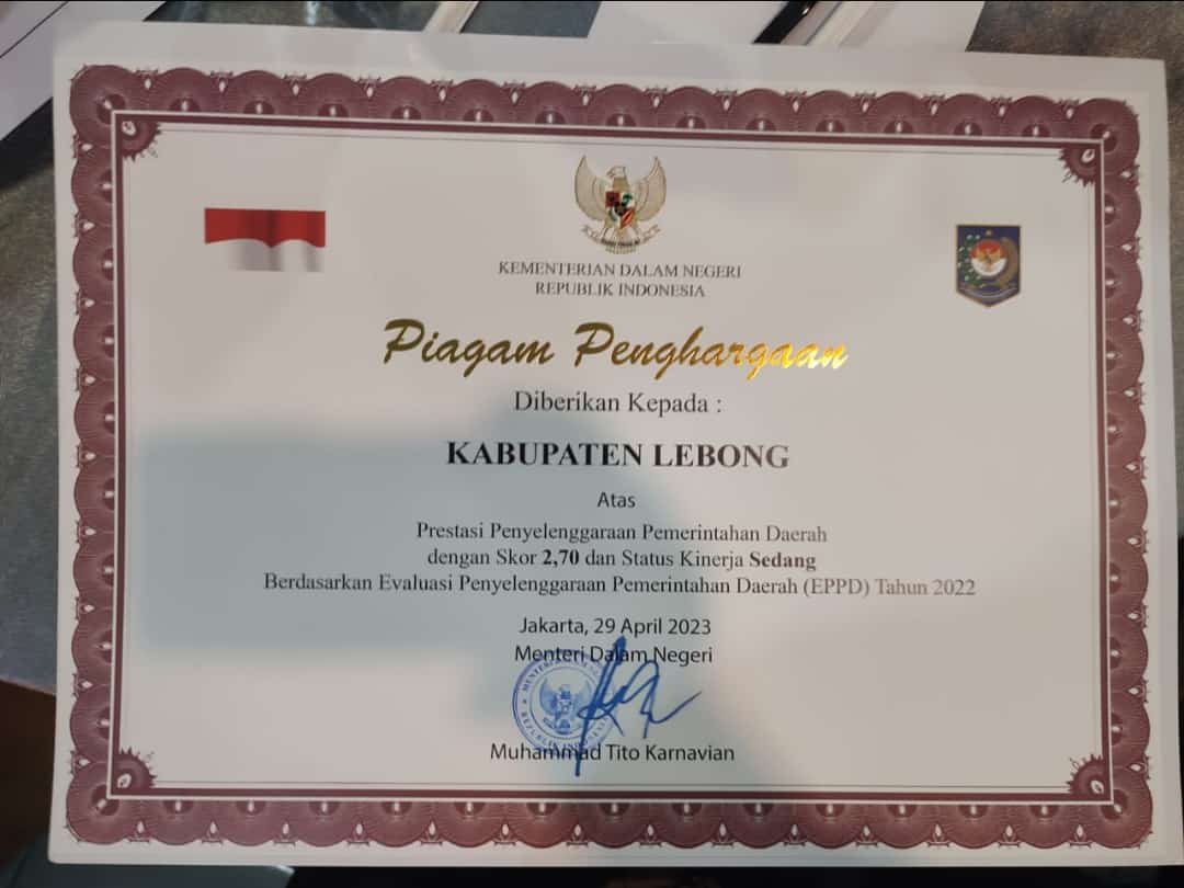 Sekda Lebong, Mustarani Abidin melalui Kabag Pemerintahan Setda Lebong, Herru Dana Putra saat dikonfirmasi melalui telepon genggam mengatakan, Kabupaten Lebong mendapat skor 2,70 Evaluasi Penyelenggaraan Pemerintah Daerah Tahun 2022, sehingga Kemendagri memberikan penghargaan atas prestasinya sebagai Penyelenggaraan Pemerintahan Daerah dengan Status Kinerja Sedang berdasarkan Evaluasi Penyelenggaraan Pemerintahan Daerah (EPPD) Tahun 2022.