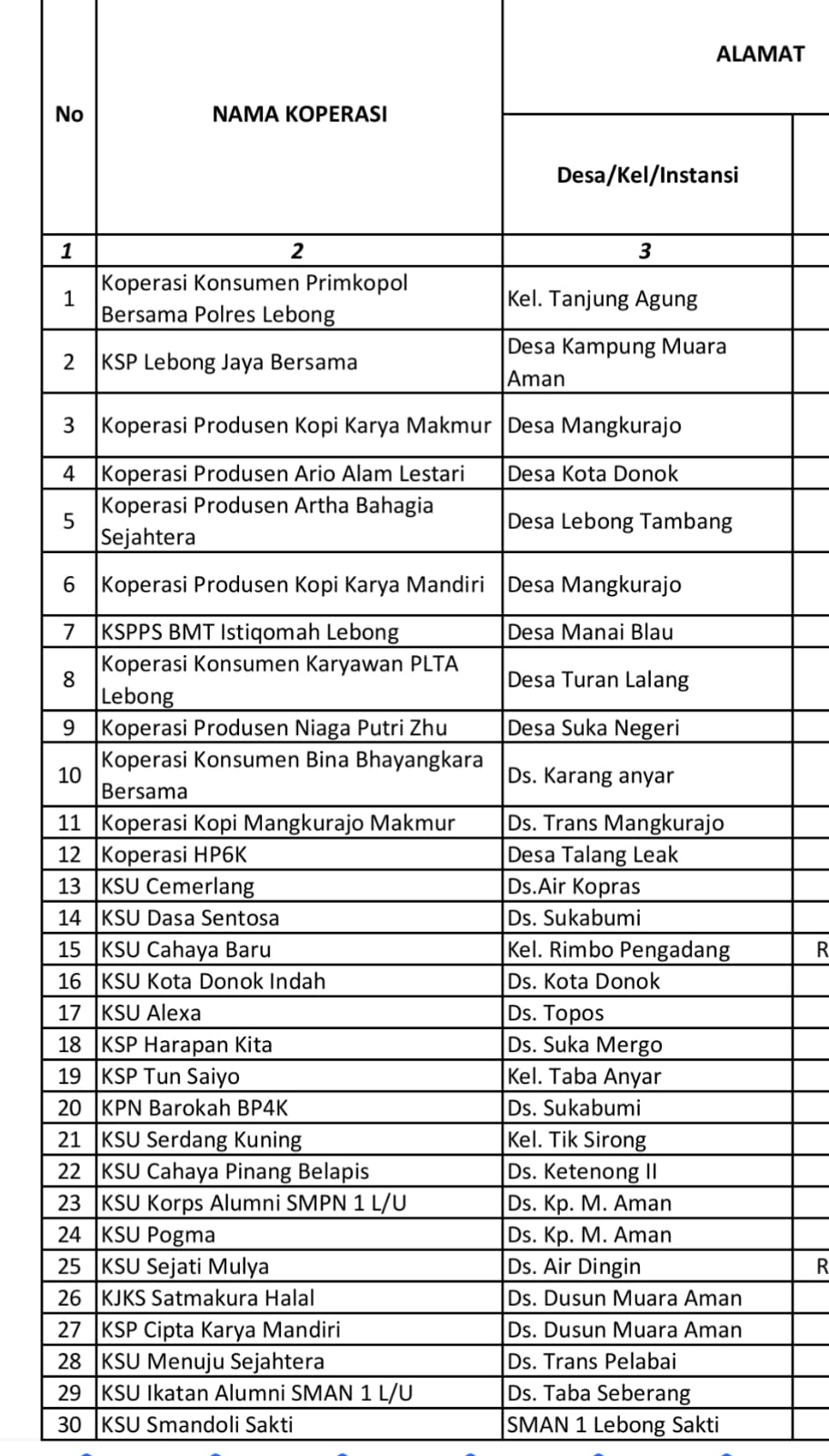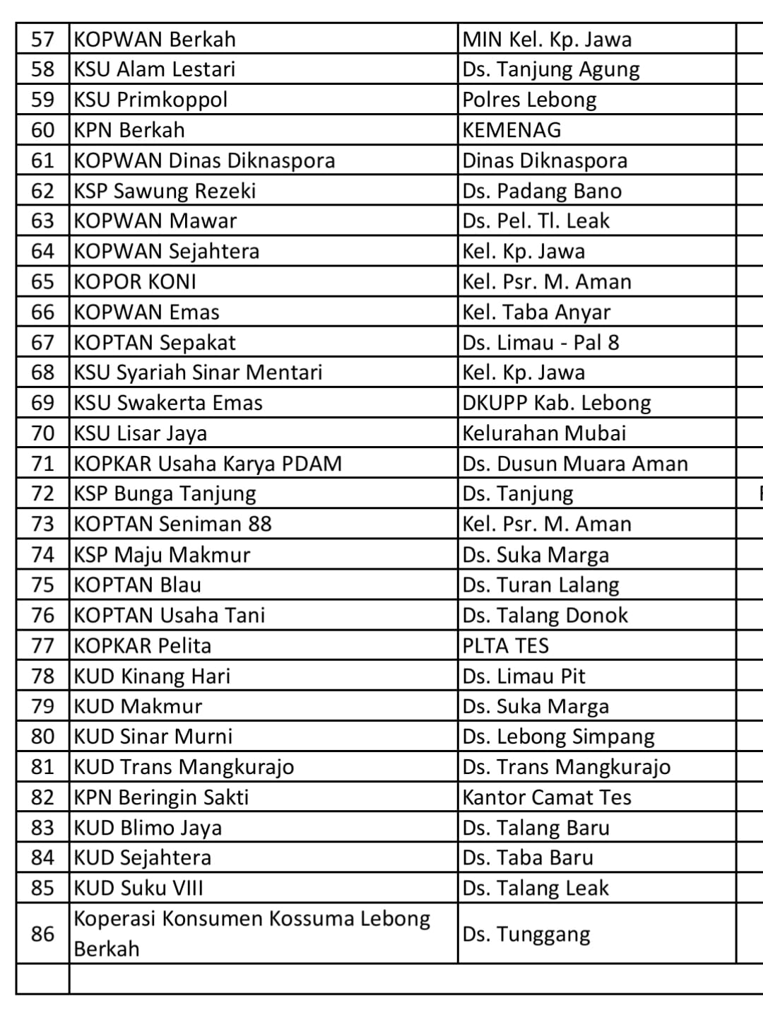 Dari jumlah itu, sebanyak 30 koperasi yang tersebar di seluruh wilayah Kabupaten Lebong, tidak aktif alias mati suri. Sedangkan, sisanya 56 aktif.