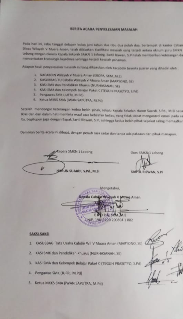 “Kami sebagai perpanjangan kepala dinas Pendidikan Nasional Provinsi Bengkulu, hari ini (8/6/2022) secara kedinasan telah memanggil kedua belah pihak yang bertikai di SMK 1 Lebong untuk diklarifikasi dan selanjut dilakukan mediasi yang akhirnya kedua belah pihak bersepakat untuk berdamai dan saling mema’afkan.” sebut Eropa.