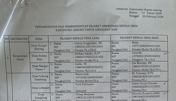 Lebong. PortalBermano.com – Pemerintah kabupaten Lebong dalam waktu dekat diperkirakan akan segera melantik 19 orang Penjabat (Pjs) kepala desa didalam 8 wilayah kecamatan yang ada di kabupaten Lebong, Hal ini terungkap berdasar Surat keputusan Bupati kabupaten Lebong H.Azhari.SH.,MH., Nomor 79 tahun 2026 tertanggal 26 Februari 2026.