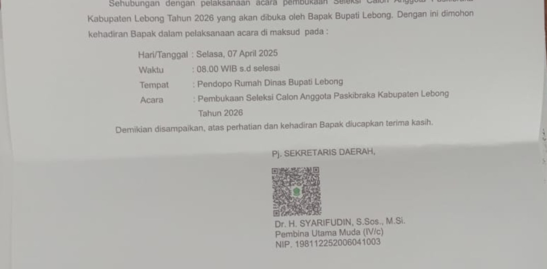 Hal ini diketahui sebagaimana surat Pj sekretaris daerah kabupaten nomor : B-400.14.1.1/7/KESBANGPOL/2026 tertanggal 2 April 2026 prihal undangan pembukaan seleksi calon anggota Paskibraka kabupaten Lebong tahun 2026 bertempat di pendopo rumah dinas Bupati.