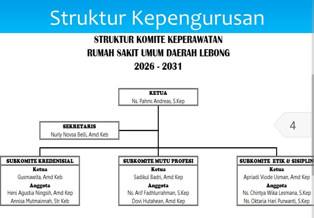 Pengukuhan ini bertujuan memastikan seluruh perawat bekerja sesuai standar pelayanan, kode etik, dan peraturan yang berlaku, yang seringkali mencakup pengurus dari subkomite kredensial, mutu profesi, dan etik disiplin.Demikian ketua komite Perawat Rsud Lebong Ns, Pahmi Andreas,S.Kep.,(RMF-NikBong)