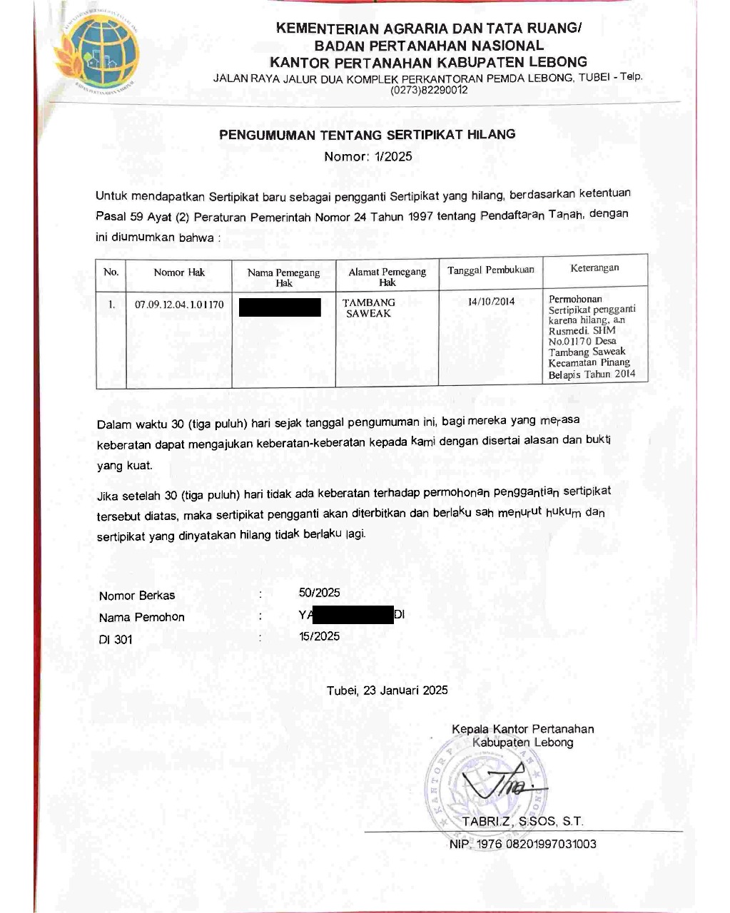 Jika semua persyaratan lengkap dan tidak ada keberatan dari pihak lain selama masa sanggah, maka akan diterbitkan Sertipikat Pengganti Demikian Dicky Suhendar, S.H Koordinator Subtansi (Korsub) Pendaftaran Hak Kantor ATR/BPN kabupaten Lebong (RMF-NikBong)